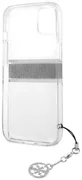 Funda Guess con carácter clásico: funda clásica transparente acabada con rayas plateadas y logotipo Guess colocado en la impresión que muestra el material Saffiano 4G.