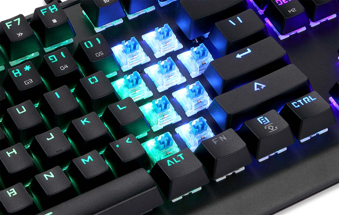 El dispositivo se ha adaptado principalmente a las necesidades de los jugadores y trabajadores de oficina. Los interruptores OutEm Blue extremadamente robustos proporcionan una respuesta rápida y un funcionamiento suave, lo que te permite disfrutar incluso de la experiencia de juego más dinámica. ¡Asegúrate de que cada pulsación de tecla se grabe correctamente y bate otro récord!